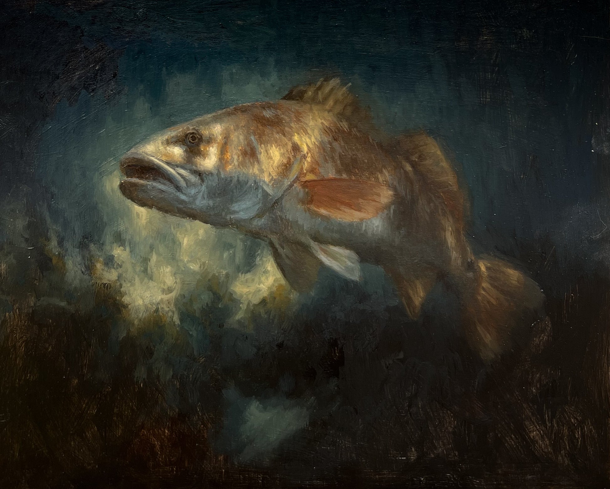 Original oil painting of a Redfish on linen panel by Pensacola artist, Loren Miller.